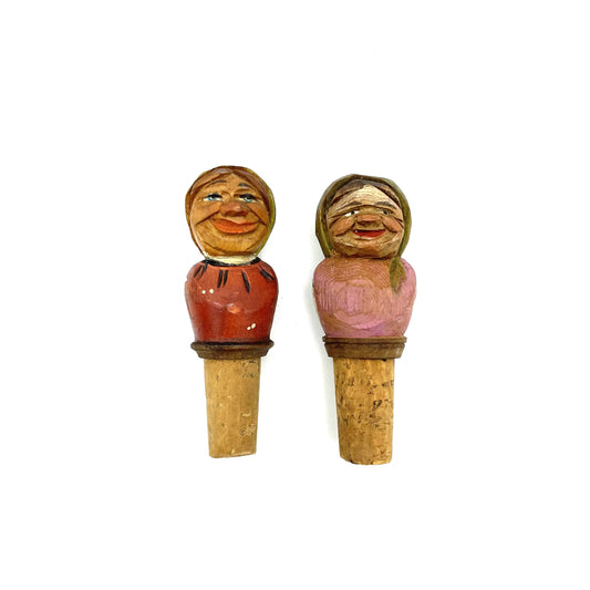 Pair of Vintage Black Forest Hand Carved Wood Cork Stoppers - 10cm