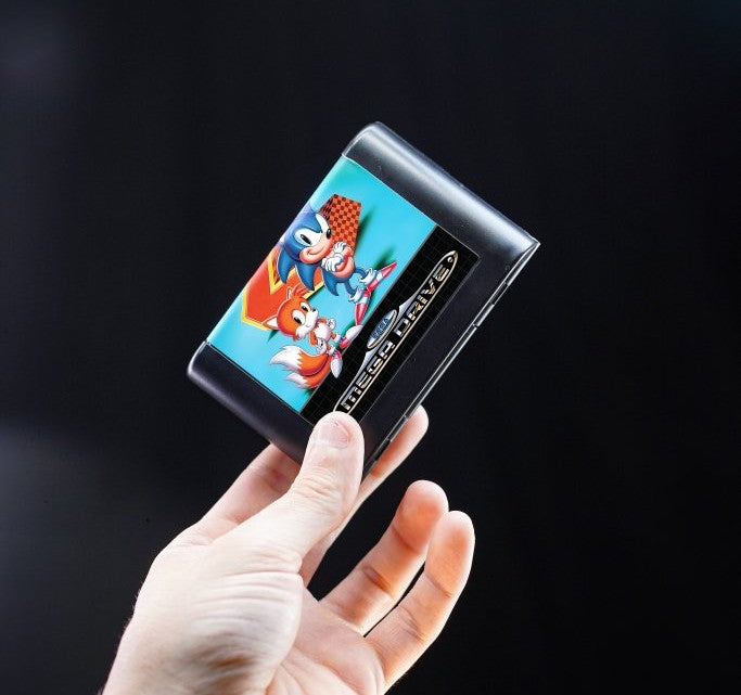 Cartridge is sized to match the original Sega Mega Drive game cartridge, folding shut for compact display (figures do not store inside).