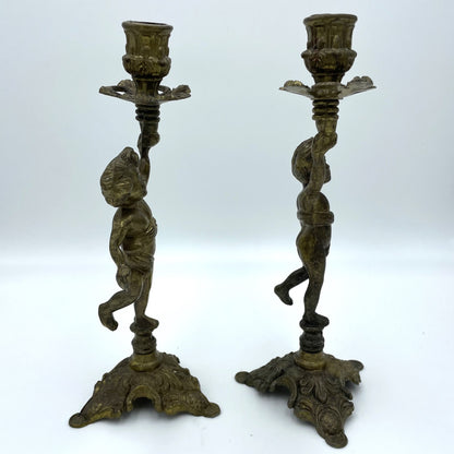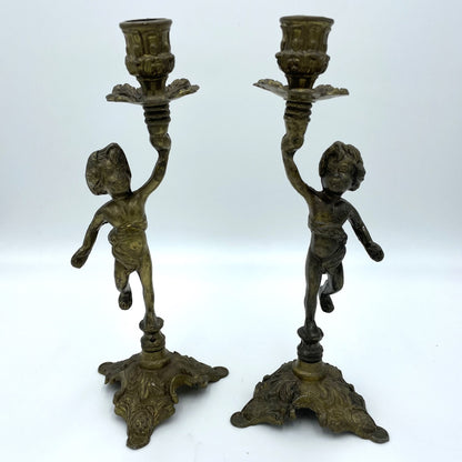 Italian Brass Cherub Candle Holder Pair - 25cm