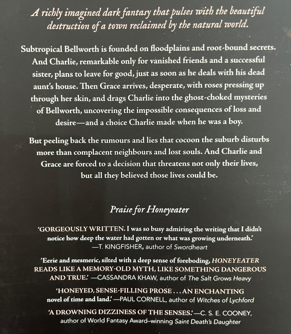 Subtropical Bellworth is founded on floodplains and root-bound secrets. And Charlie, remarkable only for vanished friends and a successful sister, plans to leave for good, as soon as he deals with his dead aunt's house. Then Grace arrives, with roses pressing up through her skin, and drags Charlie into the ghost-choked mysteries of Bellworth, uncovering the impossible consequences of loss and desire - and a choice Charlie made when he was a boy.